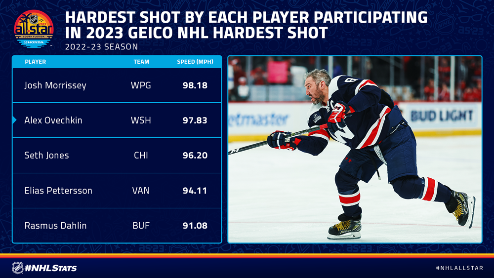 Alors qu'Ovechkin est le seul membre du groupe 2023 Hardest Shot à avoir remporté l'épreuve précédemment, Morrissey a le tir le plus puissant enregistré parmi le groupe de la saison 2022-23.