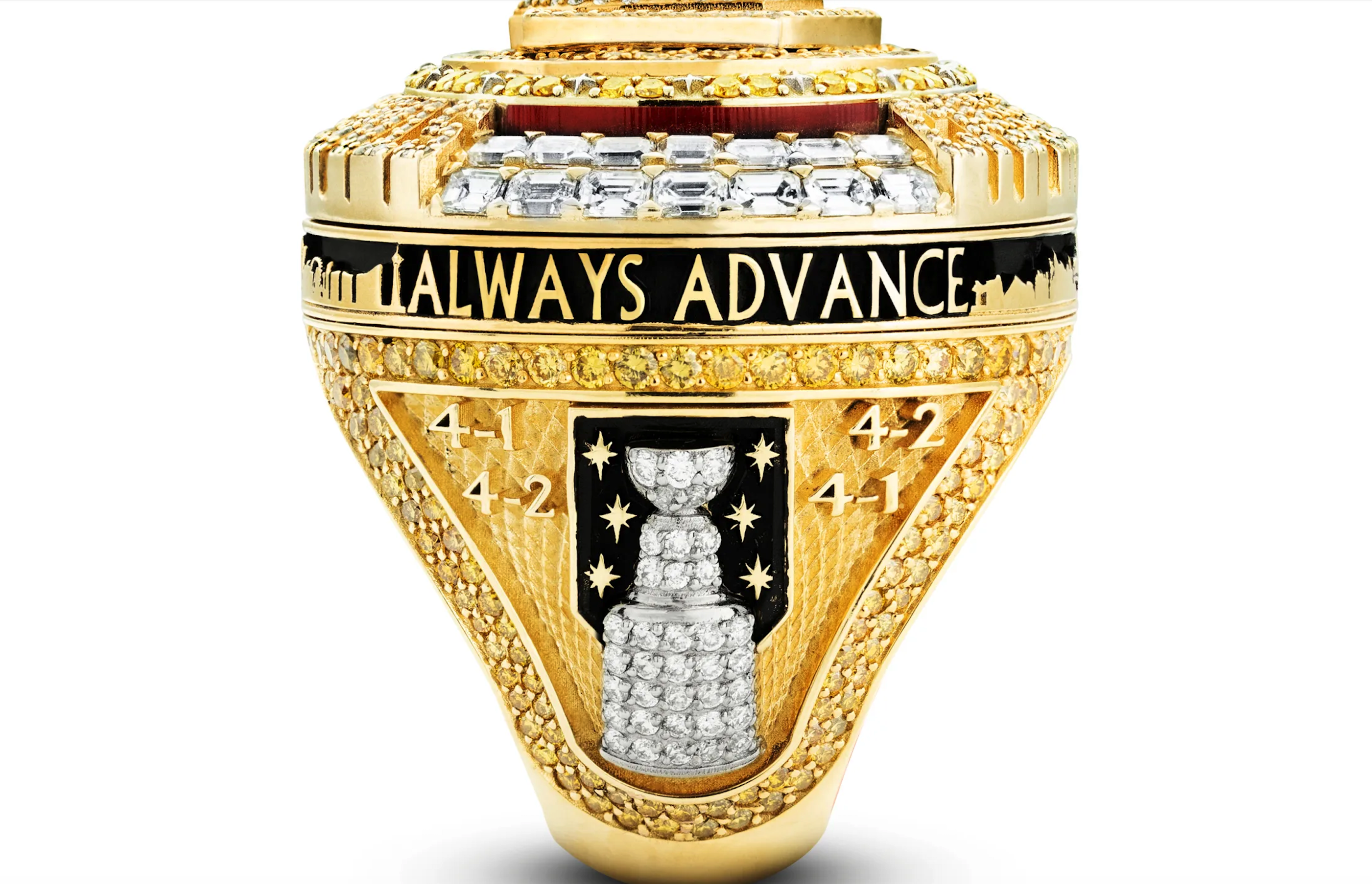 Les 16 étoiles sur le devant de la bague représentent les 16 victoires de l'équipe en séries éliminatoires, tandis que les 67 diamants blancs sertis sur le casque du logo principal honorent le nombre total de victoires en saison régulière et en séries éliminatoires. Les 32 diamants du chaton intérieur représentent les 32 équipes de la LNH.