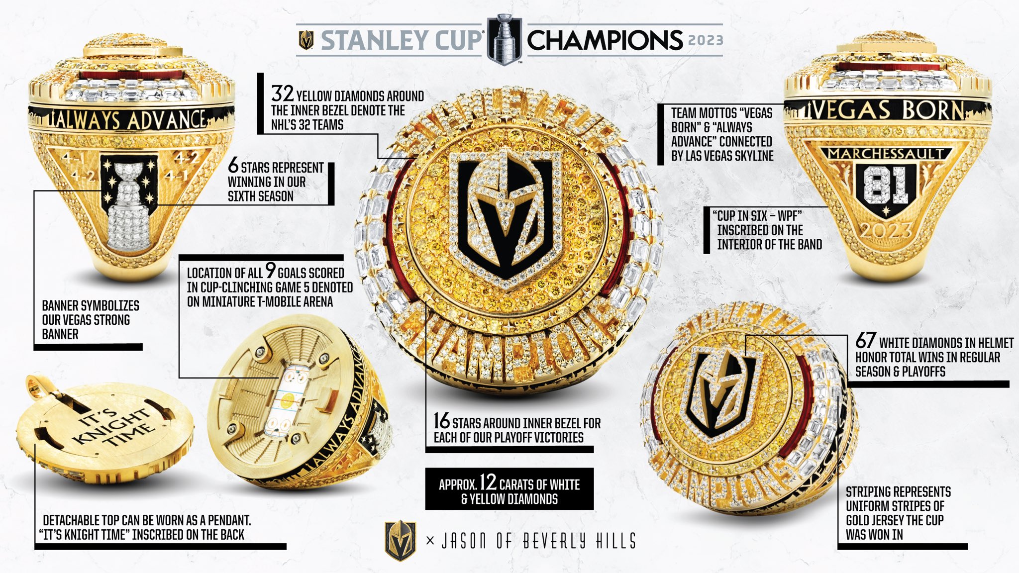 Six pierres entourent une coupe Stanley en diamant, représentant les six saisons de la franchise et serties en forme d'étoile qui correspond à la bannière "Vegas Strong" de l'équipe, qui rend hommage aux victimes du 1er octobre. Les diamants de 0,54 carats qui ornent la coupe Stanley rendent hommage aux 54 victoires de l'équipe en séries éliminatoires.