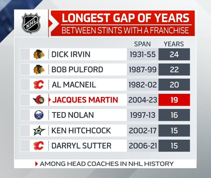 Jacques Martin passera derrière le banc d'Ottawa pour la première fois depuis 2004. Il devient ainsi le 4e entraîneur-chef à avoir attendu le plus de temps pour coacher une même franchise.
