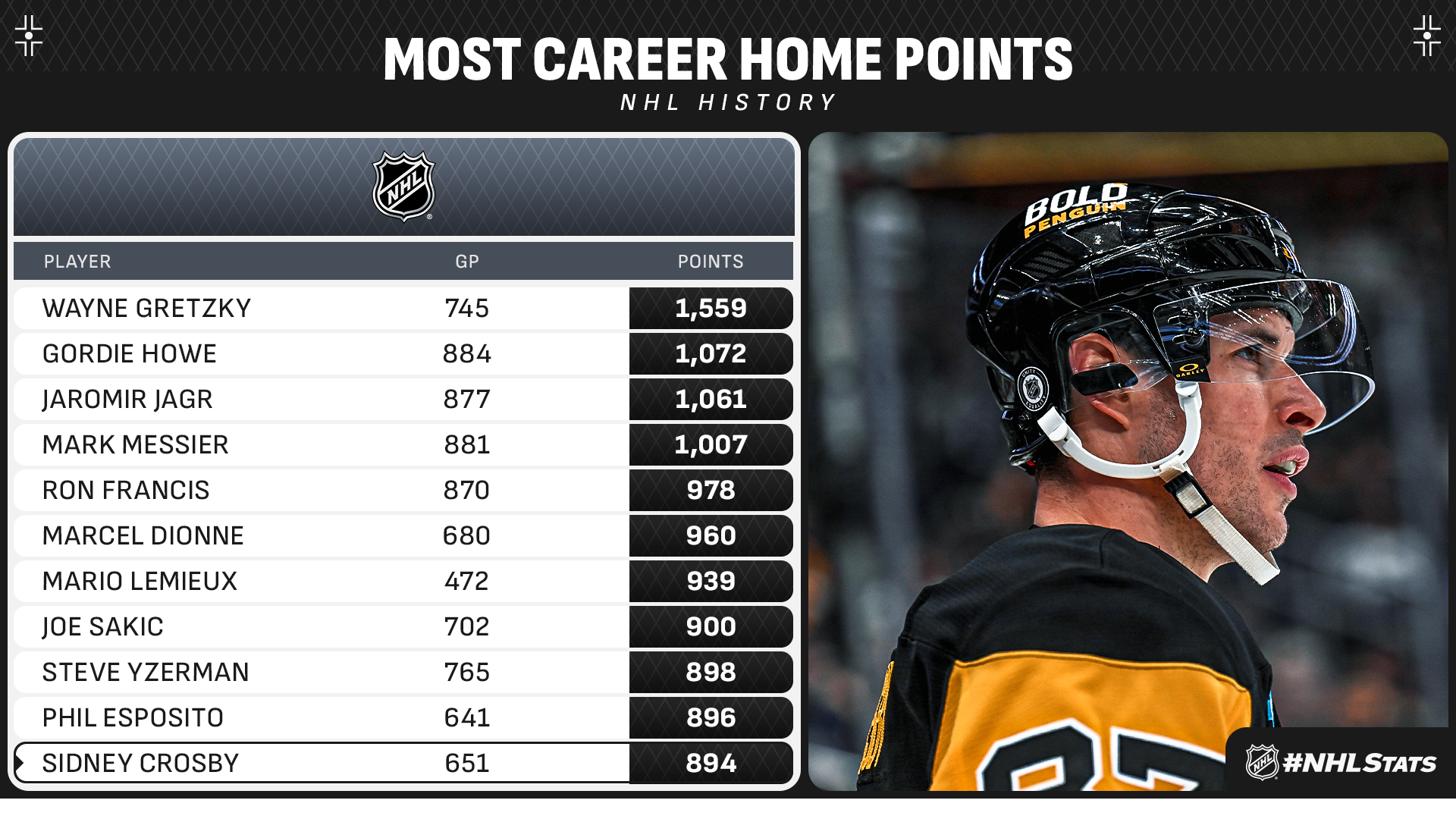 Crosby a besoin d'un match à plusieurs points pour dépasser Steve Yzerman (477 matchs) au septième rang de l'histoire de la Ligue et peut également grimper dans la liste des points à domicile de tous les temps grâce à une telle performance.
