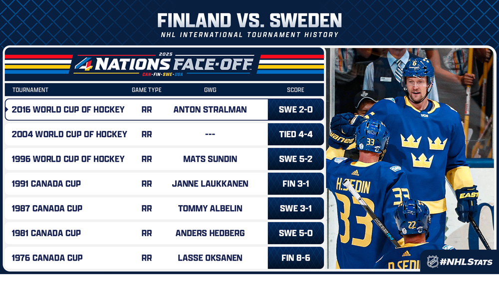 La Suède et la Finlande se sont affrontées lors d'un match olympique pour la médaille d'or, la Suède battant la Finlande 3-2 aux Jeux olympiques de 2006 à Turin, en Italie. Teemu Selanne (FIN) et Daniel Alfredsson (SWE), deux des légendes qui ont participé à la cérémonie d'ouverture du Face-Off des 4 Nations, ont pris part à ce match. Les deux pays se sont également disputés l'or à quatre reprises lors du Championnat du monde, chacun ayant remporté deux victoires (Finlande : 2011 et 1995 ; Suède : 1998 et 1992).